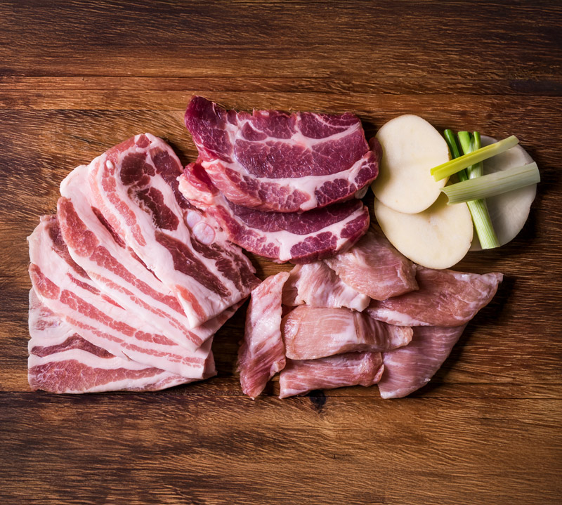 Parmi nos produits : sauté de boeuf, émincé de bœuf, sauté de porc, émincé de porc, rôti de porc, jambon en tranches, épaule de porc en dés, ou encore saucisses de la charcuterie Herrscher à Colmar.